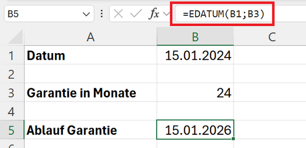 Sollte die Garantiefrist in Jahre angegeben sein, dann können Sie hierfür auch die Funktion EDATUM() einsetzen. Geben Sie hier im zweiten Argument die Anzahl der Jahre ein und multiplizieren Sie diese mit 12, da ein Jahr aus 12 Monaten besteht.