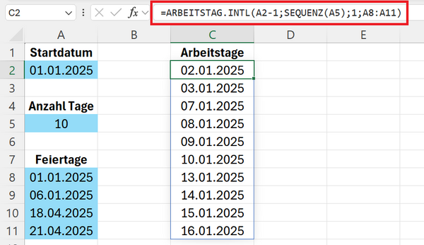 Die Formel beruht auf der Excel-Funktion ARBEITISTAG.INTL(). Sie berechnet automatisch ein Datum, das eine bestimmte Anzahl von Arbeitstagen vor oder nach einem Startdatum liegt. Wochenenden (Samstag und Sonntag) werden dabei ausgeschlossen. Um auch Feiertage auszuschließen, können diese optional als Argument hinzugefügt werden.