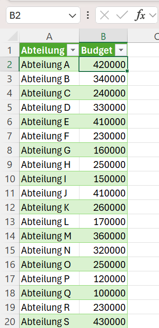 Da in der Spalte Budget sich der Jahreswert befindet, können Sie nun den entsprechenden Monatswert berechnen, indem Sie den Wert der Spalte Budget durch 12 dividieren.