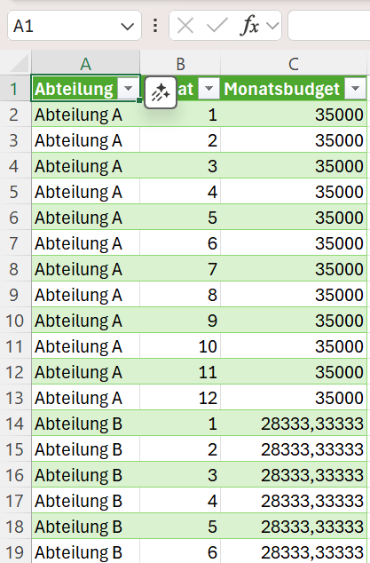 Die folgende Abbildung soll als Beispiel dienen. Sie sehen in der Liste Jahresbudgets für einzelne Abteilungen, die gleichmäßig auf die Monate aufgeteilt werden sollen. Für jeden Monat soll eine Zeile mit einem Zwölftel des Jahresumsatzes erstellt werden.
