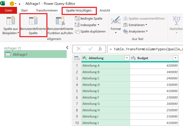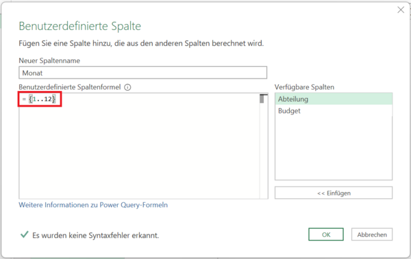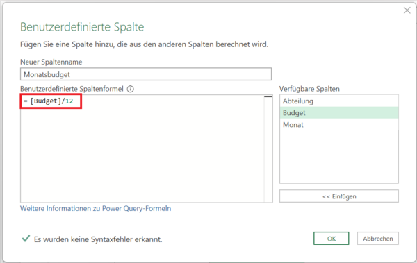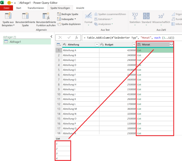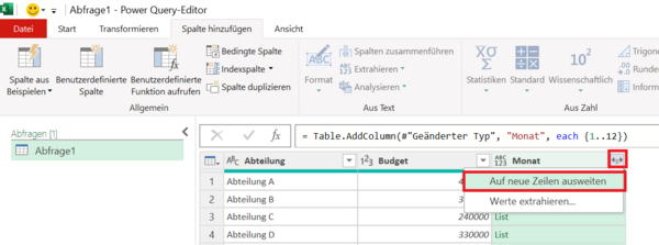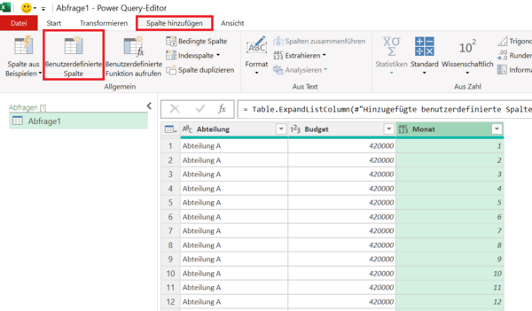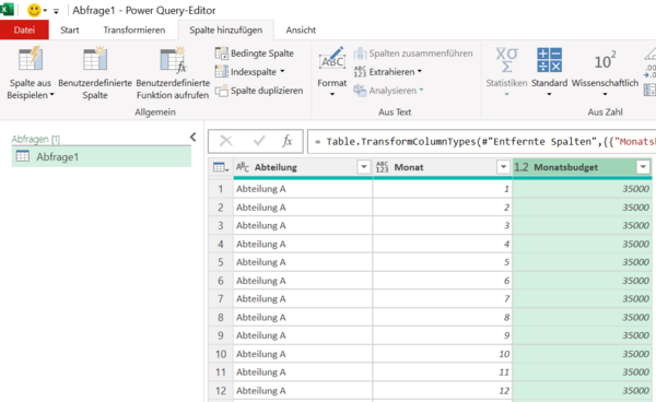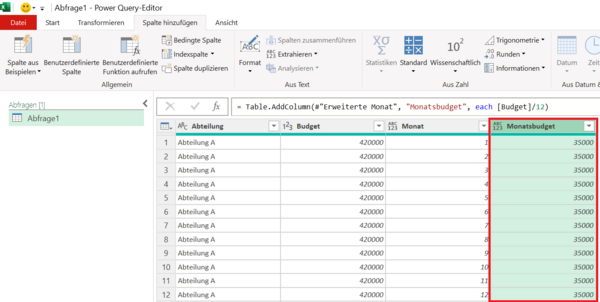 Berechnungen in Power QueryJahresbudget mit Power Query auf Monate aufteilen
