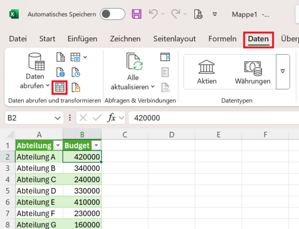 Klicken Sie auf eine Zelle in der Tabelle und aktivieren Sie im Menüband die Befehlsfolge Registerkarte Daten > Befehlsgruppe Daten abrufen und transformieren > Befehl Aus Tabelle/Bereich.