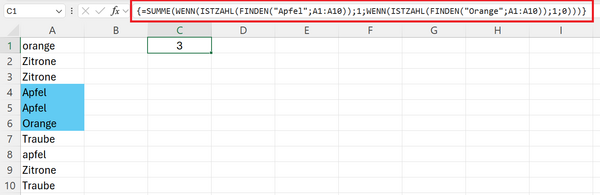 {=SUMME(WENN(ISTZAHL(FINDEN("Apfel";A1:A10));1; WENN(ISTZAHL(FINDEN("Orange";A1:A10));1;0)))}