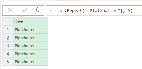 Quelle = List.Repeat({"Platzhalter"}, 5)