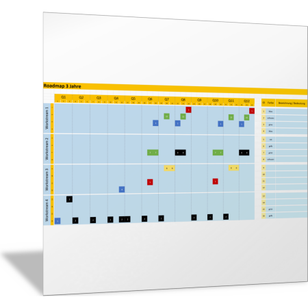 Mit dieser Excel-Vorlage bilden Sie Ihre Roadmap in einer einfachen Übersicht ab. Das Zeitraster dieser Variante ist 3 Jahre. Sie zeigen auf vier unterschiedlichen Ebenen (Workstream) die zeitliche Entwicklung von entsprechenden Elementen auf. Jeden Workstream können Sie wiederum in vier Bereiche unterteilen.