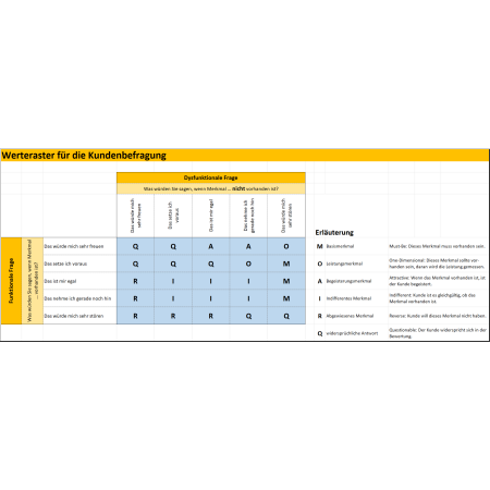 Dann tragen Sie in der Tabelle UMFRAGEERGEBNISSE alle Antworten aller Kunden ein. In der Auswertetabelle erkennen Sie, welcher Kano-Kategorie das Merkmal in der Summe aller Kundenantworten zugerechnet werden kann.