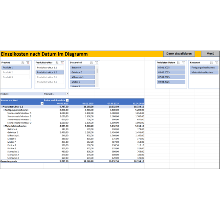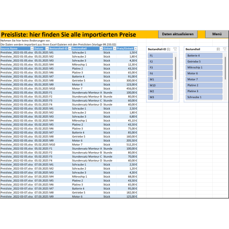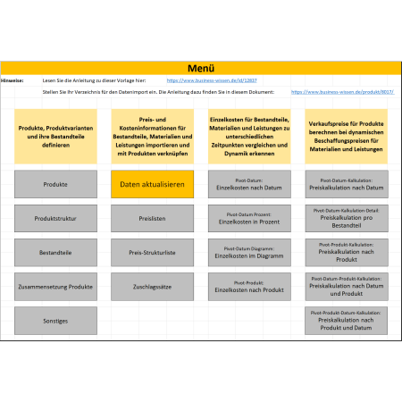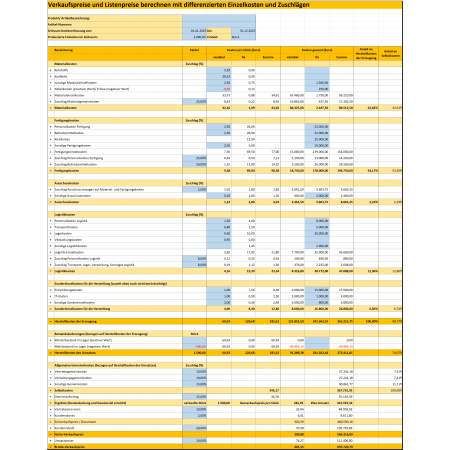 Dazu finden Sie in diesem Dokumentenpaket ein Excel-Tool, mit dem Sie Ihre Preise kalkulieren und vergleichen bei dynamischen Einzelkosten. Sie importieren mehrere Listen mit den unterschiedlichen Materialpreisen und Beschaffungskosten und analysieren, welche Effekte steigende Kosten auf den Verkaufspreis Ihrer Produkte haben. Insbesondere Vertrieb und Verkauf in Ihrem Unternehmen können das Tool nutzen, um Angebote für Kunden zu erstellen und bei Bedarf im Verkaufsprozess an die jeweilige Kostensituation anzupassen.