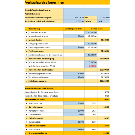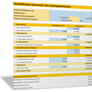 Außerdem ist in diesem Dokumentenpaket Schritt für Schritt erläutert, wie Sie Herstellkosten, Selbstkosten und Verkaufspreise ermitteln und berechnen. Das sind die etablierten Methoden und Verfahren der Kostenträgerrechnung. Für die Berechnung finden Sie dazu mehrere Excel-Vorlagen für die Berechnung der Herstellkosten und der Selbstkosten mit Zuschlagskalkulation; in einer einfachen und einer nach Kostenarten differenzierten Variante.