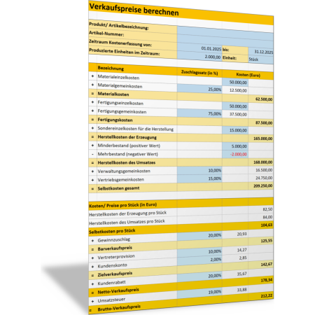 Mit dieser Excel-Vorlage berechnen Sie den Verkaufspreis eines einzelnen Produkts. Sie erfassen dazu die einzelnen Kosten und berechnen damit die Selbstkosten des Produkts. Anschließend legen Sie Zuschläge fest, die sich aus den Gewinnerwartungen und dem Vertrieb des Produkts ergeben. So berechnen Sie Netto- und Brutto-Verkaufspreis.