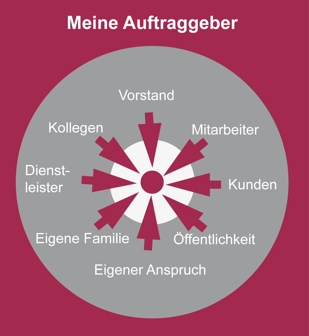 „Alle zerren an mir.“ Das sagte kürzlich der Bereichsleiter eines mittelständischen Unternehmens – nennen wir ihn Hans Huber – während einer Coachingsitzung zu mir. „Wer sind alle?“, fragte ich ihn und protokollierte seine Aussage in einer Zeichnung. Anschließend übergab ich sie ihm mit den Worten „Das sind Ihre Auftraggeber“: