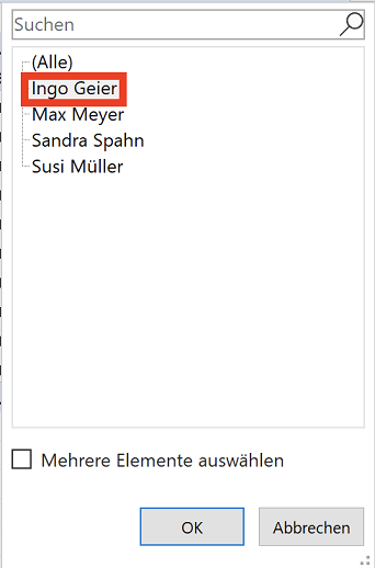 Wenn Sie auf das Filter-Symbol in dieser Zelle klicken und in der Liste einen einzelnen Verkäufer (Ingo Geier) auswählen, dann werden nur noch die Verkäufe mit dem ausgewählten Verkäufer im Werte-Bereich der Pivot-Tabelle dargestellt.
