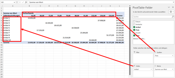 Dann werden alle Daten des Datenbereichs sofort in der Pivot-Tabelle dargestellt. Die folgende Abbildung zeigt, dass Artikel in den Zeilenbereich, der Preis in den Spaltenbereich und die Umsätze (Wert) in den Wertebereich gezogen wurden.