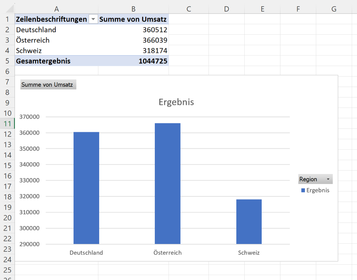 In der folgenden Abbildung sehen Sie ein Pivot-Chart, das die Umsätze nach Region als Säulendiagramm darstellt. Das Pivot-Chart beruht auf der Pivot-Tabelle, die direkt darüber im Bereich A1:B5 angeordnet ist.
