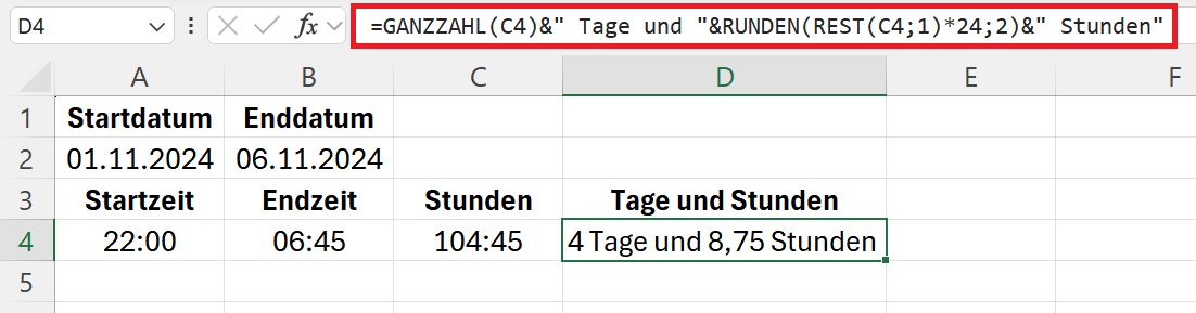 Falls Ihre Zeitspanne über Mitternacht hinausgeht, wie zum Beispiel von 22:00 Uhr bis 06:00 Uhr am nächsten Tag, muss Excel erkennen, dass die Endzeit am Folgetag liegt. Hier hilft eine Anpassung in der Formel.