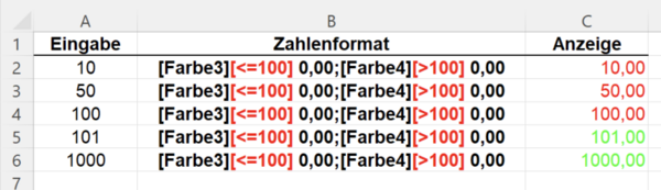 Im folgenden Beispiel werden Zahlen kleiner gleich 100 [<=100] in Rot [Farbe3] dargestellt. Die Zahlen größer 100 [>100] in Grün [Farbe4]. Die entsprechende bedingte Angabe im Format-Code für benutzerdefinierte Zahlenformate sehen Sie in Spalte B der folgenden Abbildung.