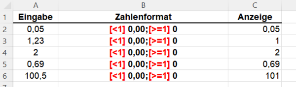 Dazu erfassen Sie die entsprechende Bedingung in eckigen Klammern. Die Bedingung selbst besteht aus einem Vergleichsoperator und einem Wert. Im folgenden Beispiel werden Werte unter 1 [<1] mit einer führenden Null und zwei Nachkommastellen angezeigt; das Format ist: 0,00. Werte größer oder gleich 1 [>=1] werden ohne Nachkommastellen und auf ganze Zahlen gerundet dargestellt, gemäß der Formatierungsangabe: 0.