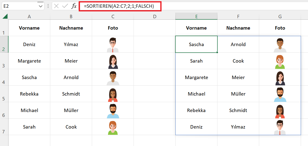 Außerdem können Sie die Namensliste (siehe oben) sortieren. Die Fotos der jeweiligen Personen werden automatisch mit sortiert. Am einfachsten geht das über die Funktion SORTIEREN(). Die folgende Abbildung zeigt das Ergebnis.