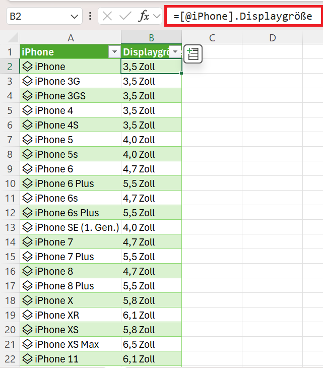 Für das folgende Beispiel, das Produkt iPhone, liegen sämtliche relevante Produktinformationen in einer einfachen Tabelle vor. Um auf diese Informationen komfortabel zugreifen zu können und um individuelle Produktübersichten zu erstellen, soll ein passender Datentyp definiert werden.