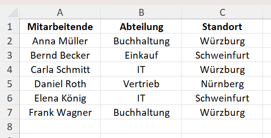 Beispiel: Sie möchten zunächst alle Mitarbeitenden am Standort Würzburg herausfiltern – und anschließend nur bestimmte Personen daraus weiterverarbeiten.