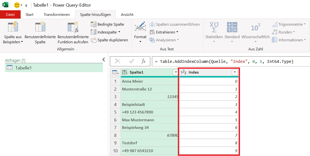 Ihre Liste besteht aus wiederkehrenden Blöcken von fünf Zeilen (Name, Straße, PLZ, Ort, Telefon). Um diese zu trennen, fügen Sie nun zunächst eine neue Indexspalte hinzu:
