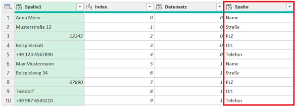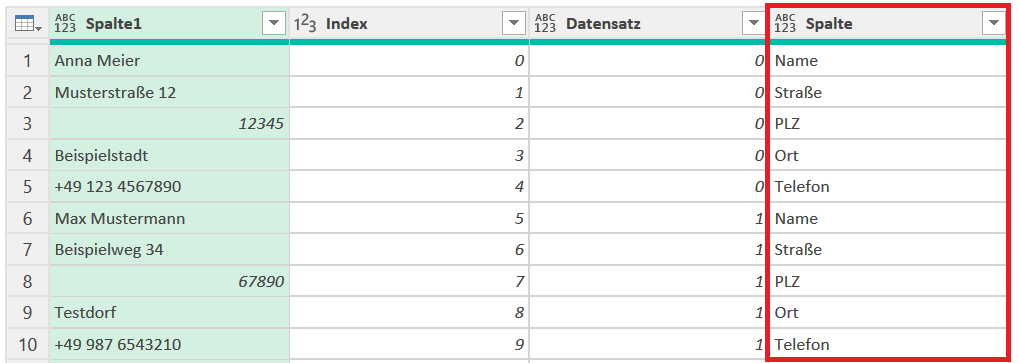 Hinweis: Indem Sie Spalte1 und Spalte vergleichen, erkennen Sie, ob Ihre Zuordnung von Zelleninhalt und Typ des Inhalts korrekt ist. Anne Meier ist der Name, Musterstraße 12 ist die Straße etc.