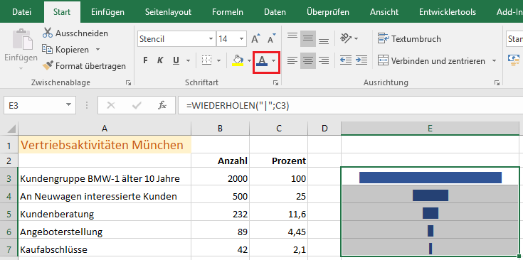Mit der Funktion WIEDERHOLEN() geben Sie eine Zeichenfolge in einer bestimmten Häufigkeit in einer Zelle aus. Das erste Argument "|" ist das Zeichen, das wiederholt werden soll.