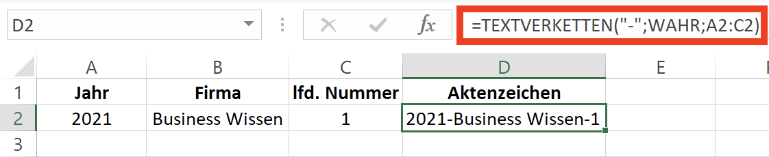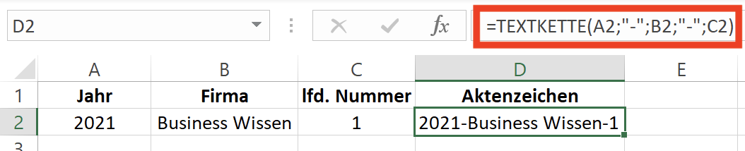 In der Zelle D2 steht dann: 2021-Business Wissen-lfd. Nummer: 1