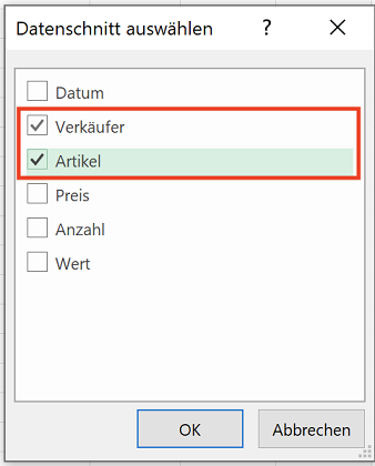 Aktivieren Sie jetzt die Kontrollkästchen für die Spalten, nach denen Sie in der Pivot-Tabelle filtern wollen. Dies wären im Beispiel die Kontrollkästchen für Verkäufer und Artikel.