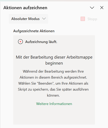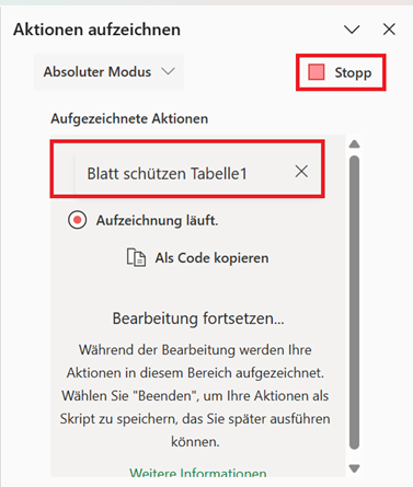 Der Bearbeitungsschritt wird automatisch im Aufgabenbereich am rechten Rand dargestellt. Stoppen Sie jetzt die Skript-Aufzeichnung, indem Sie im Aufgabenbereich auf Stopp klicken.