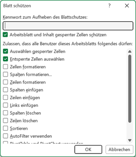 Es öffnet sich das Dialogfeld Blatt schützen. Bestätigen Sie hier die Voreinstellung und klicken Sie auf die Schaltfläche OK.