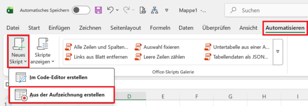 Aktivieren Sie im Menüband die Befehlsfolge Registerkarte Automatisieren > Befehl Neues Skript > Aus der Aufzeichnung erstellen.