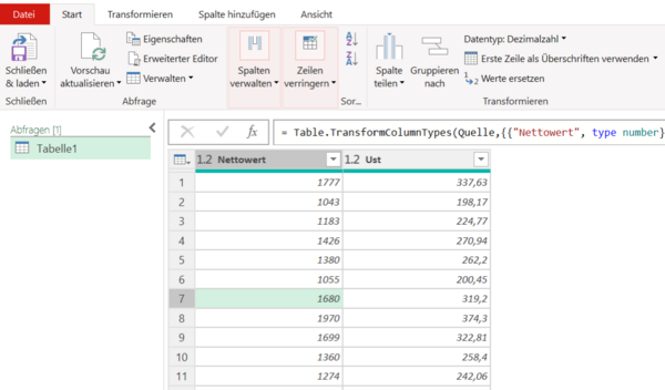 In der folgenden Abbildung sehen Sie eine mit Power Query importierte Tabelle, die den Nettowert und die darauf anfallende Umsatzsteuer enthält. Sie müssen nun eine weitere Spalte in die Abfrage einfügen, in der dann der Bruttowert steht. Er wird berechnet, indem der Nettowert und die Umsatzsteuer (Ust) addiert werden.