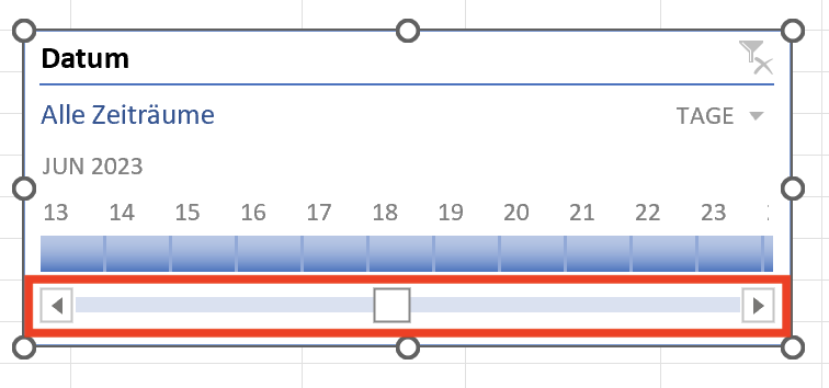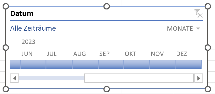 Excel fügt nun automatisch ein separates Objekt analog einem Datenschnitt ein. Mit diesem können Sie die Daten in der Pivot-Tabelle nach bestimmten Zeitkriterien filtern. Das Besondere an dem Filter Zeitachse ist, dass er speziell auf Zeit und Zeiträume ausgerichtet ist.