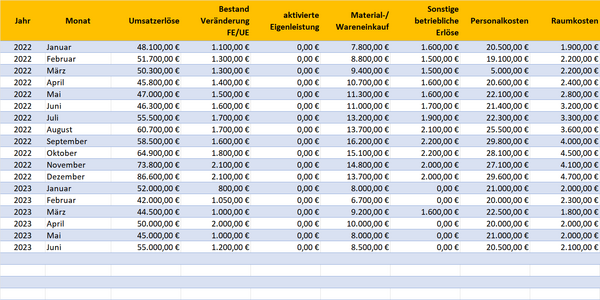 Im Tabellenblatt DATENERFASSUNG geben Sie alle Daten aus der BWA manuell ein. Dabei erfassen Sie nur die „Rohdaten“ aus der Buchhaltung – nicht, was daraus dann berechnet wird. Sie sehen anhand der Spaltentitel, was jeweils eingetragen werden soll.