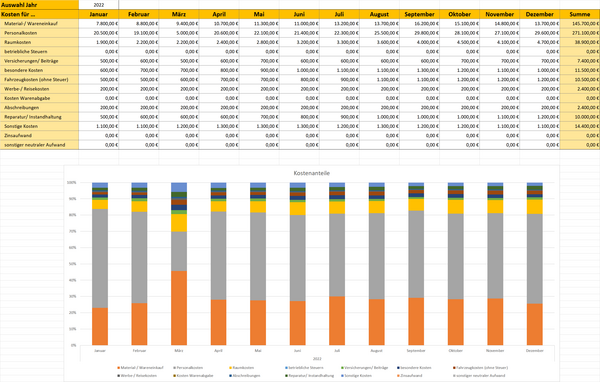Im Tabellenblatt REPORT_KOSTENANTEILE sind die einzelnen Kosten der BWA als Säulendiagramm im Jahresverlauf dargestellt. Sie erkennen, wie sich die jeweiligen Anteile (in Prozent) verändern.
