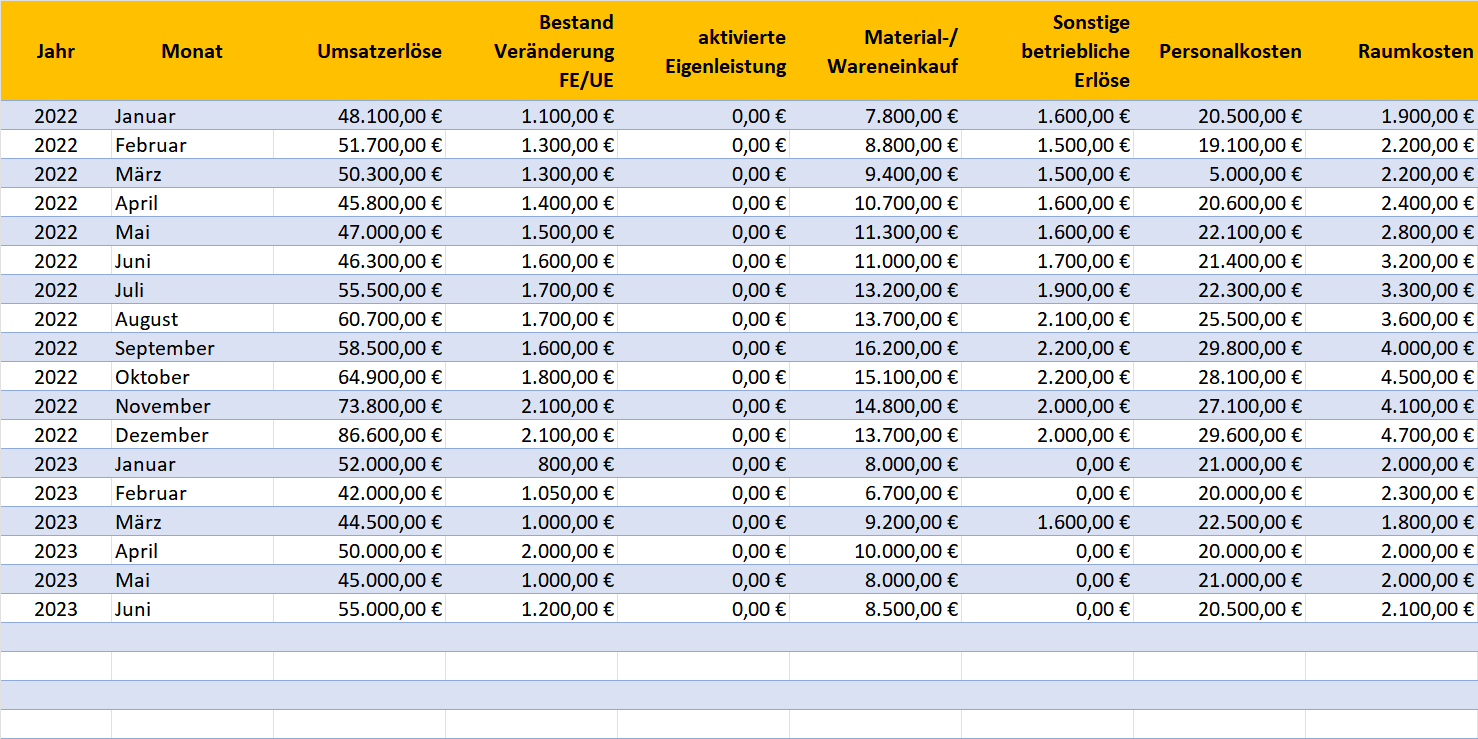 Die BWA-Daten der Buchhaltung (von Ihrer Steuerberatung) können Sie mit Excel zusammenstellen und anschließend auswerten. Dazu tragen Sie die entsprechenden Werte in der folgenden Vorlage ein.