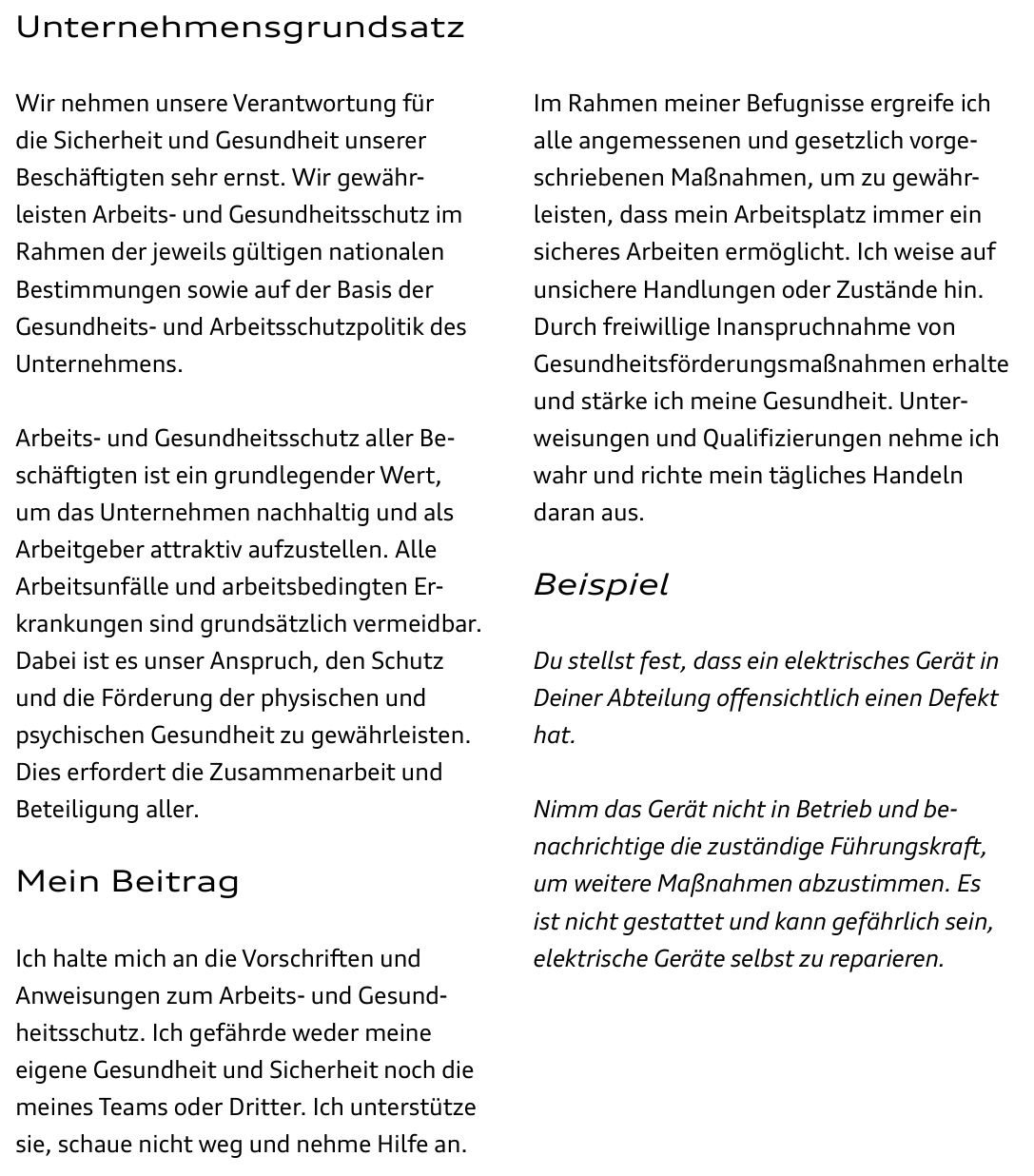 Die AUDI AG hat auf 31 Seiten einen Code of Conduct formuliert. Darin sind grundsätzliche Werte benannt und konkrete Regeln zu