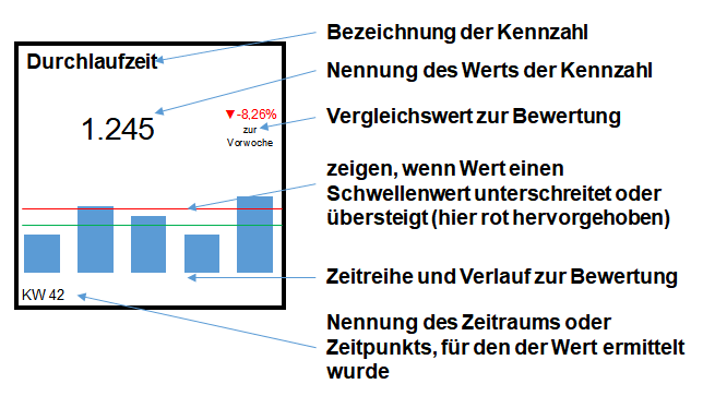 Die folgende Abbildung zeigt an einer der dargestellten Kennzahlen, mit welchen Informationen die Messwerte zu einer Kennzahl ergänzt werden können. Diese Informationen sollen die Bewertung durch die Anwenderin oder den Anwender des Dashboards erleichtern und zeigen: