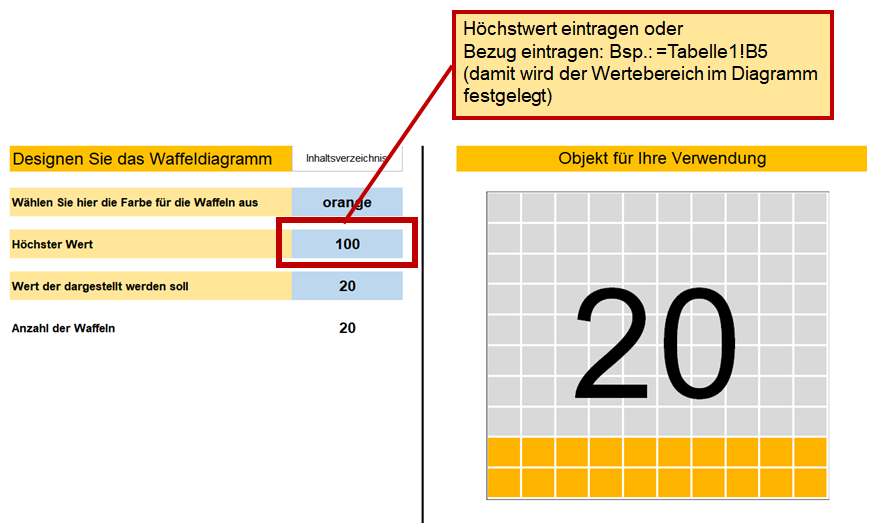 Je nachdem, welche Excel-Vorlage und Variante Sie wählen, können Sie die Größe und Farbe der Schrift auswählen, mit der der Wert der Kennzahl dargestellt wird, sowie die Farbe einzelner Diagramm-Elemente; zum Beispiel die Farbe der Waffeln in der Excel-Vorlage zur folgenden Abbildung.