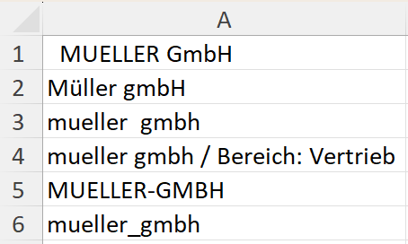 - vermischte Schreibweisen wie „Müller“, „MUELLER“, „mueller“, „mueller/Vertrieb“