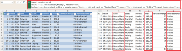 hochwertige_deutschland_online = umsatz.query("Preis > 100 and Land == 'Deutschland'").query("Vertriebskanal == 'Online'").reset_index(drop=True)