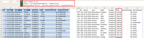 Damit steht der gesamte Datensatz als DataFrame zur Verfügung. Er enthält im folgenden Beispiel die Spalten „Datum“, „Land“, „Stadt“, „Produkt“, „Preis“, „Verkaufsmenge“ und „Vertriebskanal“.