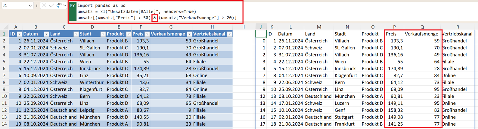 Filterbedingungen, die beide erfüllt sein sollen, entsprechen der logischen UND-Beziehung. Dafür gilt für Pandas und Python: