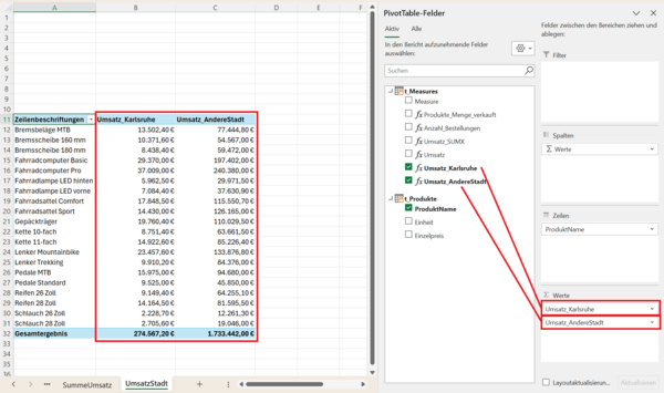 Dieses Measure zeigt immer den Umsatz, der von den Kunden in der Stadt Karlsruhe erzielt wurde – unabhängig davon, welche anderen Filter in der Pivot-Tabelle gesetzt sind.