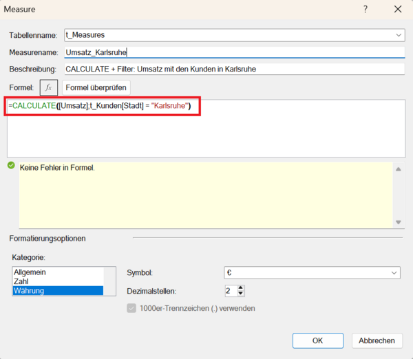 Umsatz_Karlsruhe:= CALCULATE([Umsatz]; t_Kunden[Stadt] = "Karlsruhe")