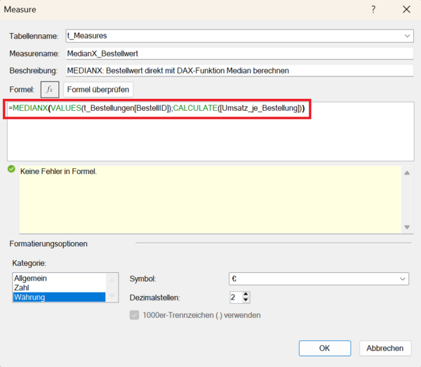 MedianX_Bestellwert:= MEDIANX(VALUES(t_Bestellungen[BestellID]); CALCULATE([Umsatz_je_Bestellung]))