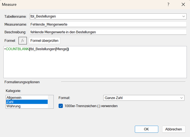 | Fehlende_Mengenwerte | COUNTBLANK( tbl_Bestellungen[Menge]) | Fehlende Mengenangaben |