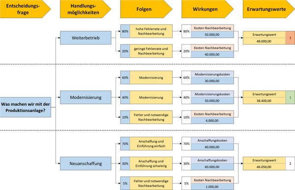 Damit können Sie eine begründete Entscheidung treffen für die Alternative „Modernisierung“, da dieser Erwartungswert für die anfallenden Kosten am geringsten ist.