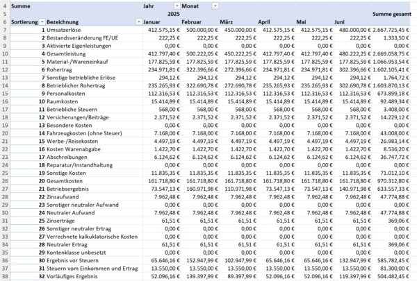 Hinweis: Die Reihenfolge (Sortierung) der Einzelpositionen legen Sie im Tabellenblatt ZUORDNUNGSTABELLE fest. Sie entspricht in der Vorlage der Reihenfolge von Datev nach dem Kontenrahmen SKR 03.