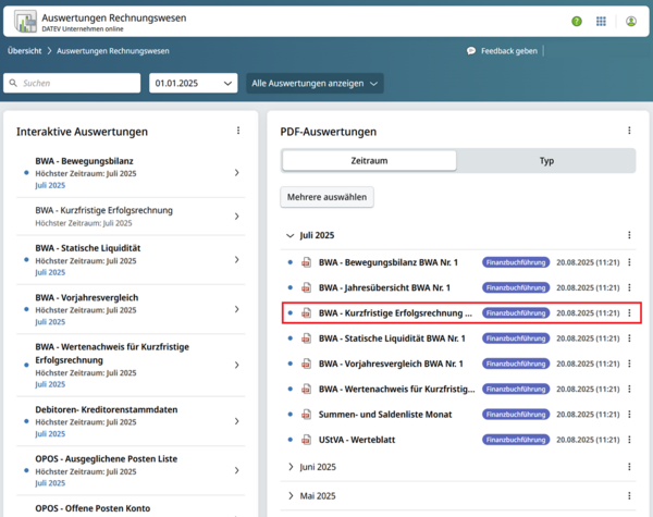 Der Standard-Report in Datev ist dabei die monatliche kurzfristige Erfolgsrechnung (BWA). Datev stellt diesen Bericht unter anderem im Format PDF zur Verfügung.